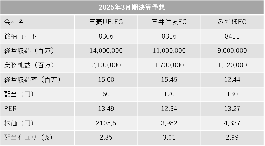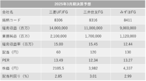期末直前!駆け込みで高配当・安定日本株購入! 未分類 X Facebook LINE コピー 2025.03.23 さて、2025年3月の期末がまもなく来ます! 日本株駆け込み購入する方もいらっしゃるでしょうね。 そこで今回は期末の高配当日本株についてです。 高配当・安定日本株といえばやはりメガバンクです。 表に3メガバンクの現状をまとめました。 みなさんはメガバンク株を所有していますか。 また、メガバンク株を購入する予定はありますか。 筆者は追加購入を考えていますよ。 それではみなさんのご健闘をお祈りいたします。